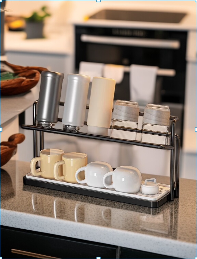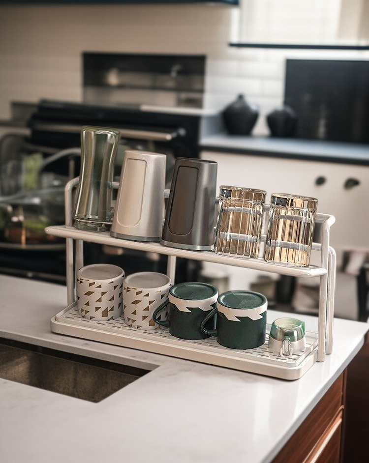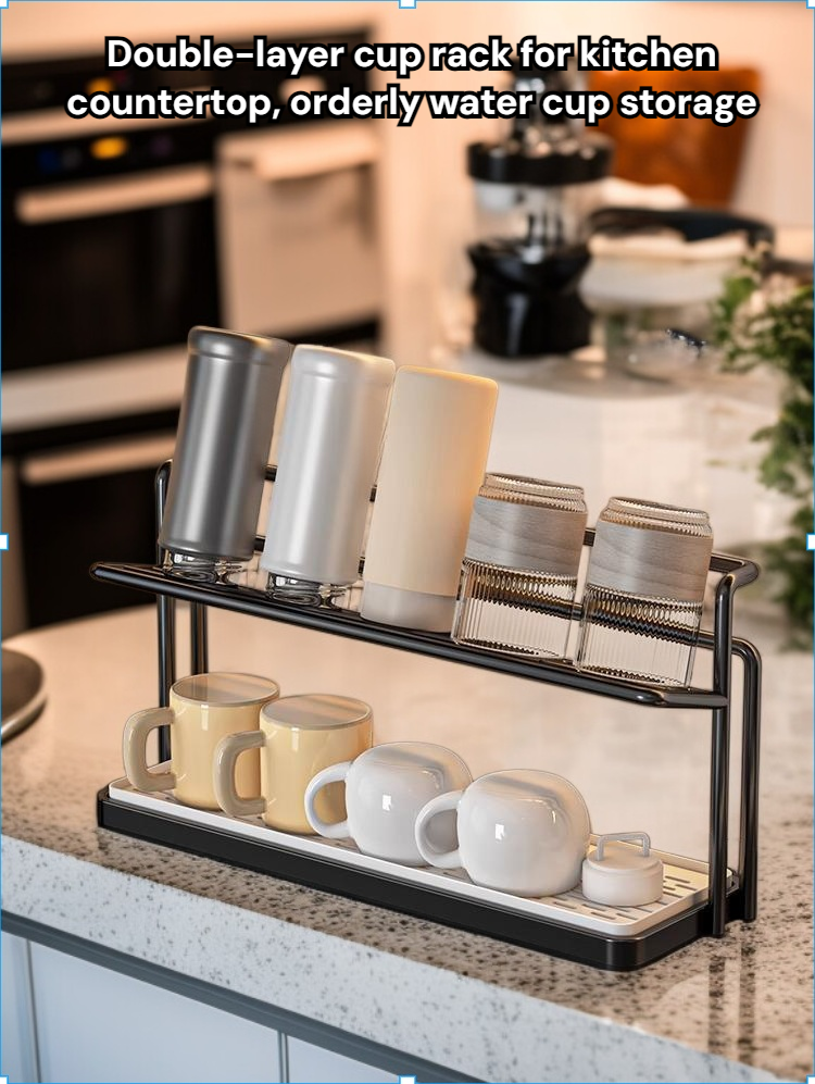 Double-layer cup rack for kitchen countertop, organized water cup storage, space-saving design, detachable drain tray, durable material, easy to clean, suitable for home and office use.